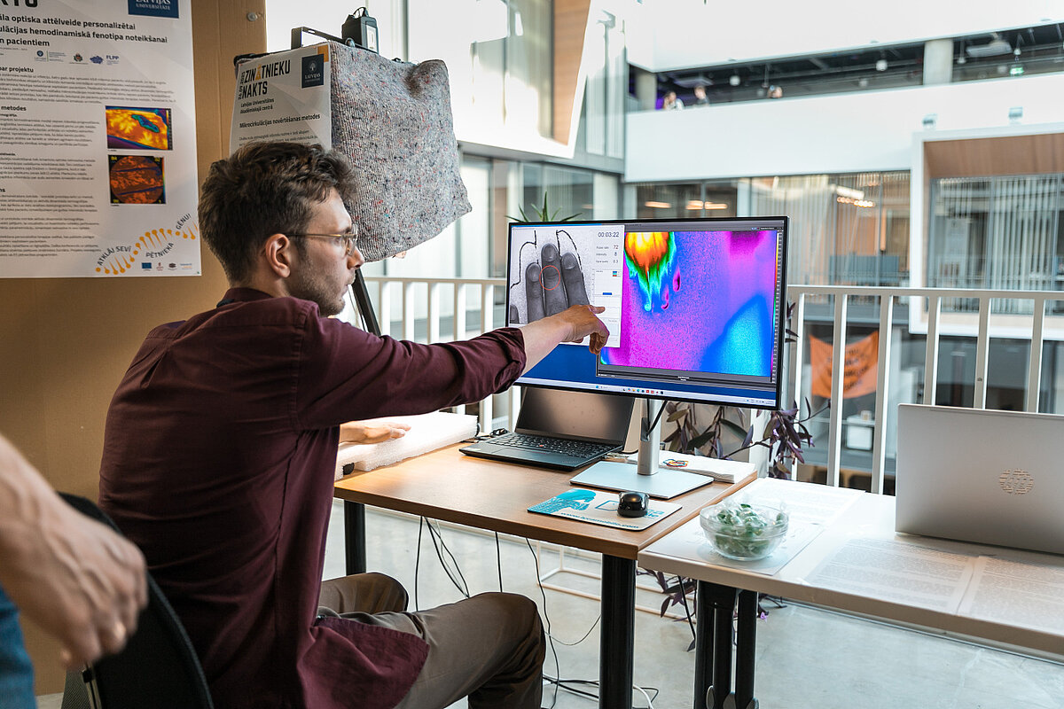 - Neredzamie attēli klīniskai diagnostikai. Video, kurā attēlota pacienta bezkontakta diagnostikas procedūra ar projektā izveidotu iekārtas prototipu, kas ļauj ātri uzņemt jebkuras ķermeņa vietas 5 attēlus dažādās spektra joslās – 3 redzamā gaismā un 2 infrasarkanā apgaismojumā. Šādu attēlu analīze ļauj atpazīt ļaundabīgus ādas veidojumus (melanomu, bazaliomu). Demonstrācija, kurā iespējams salīdzināt kādas ķermeņa daļas (piem., rokas) atstarojuma un termiskā izstarojuma attēlus, iegūstot informāciju par iespējamiem asins apgādes traucējumiem (Jānis Spīgulis, demonstrējums saskaņā ar LU ANM projekta Nr.LU-BA-PA-2024/1-0006 ‘Visa ķermeņa dermoskopiska attēlošana spektra redzamajā un infrasarkanajā diapazonā’ rezultātiem)