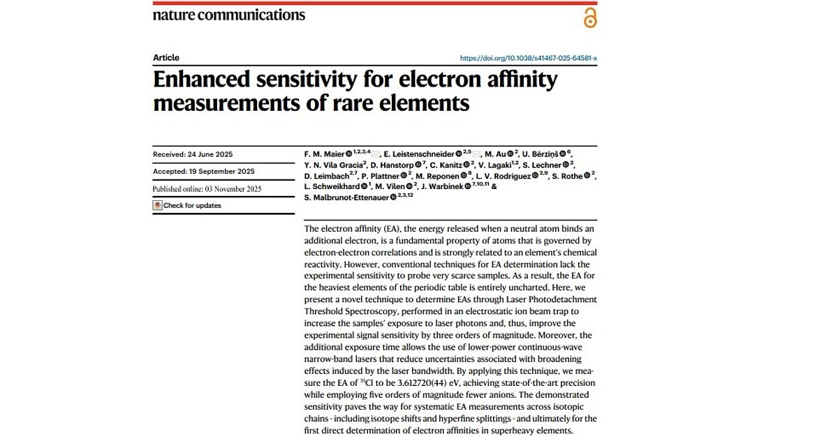 LU EZTF Atomfizikas un spektroskopijas institūta iknedēļas zinātniskajā seminārā vadošais pētnieks Uldis Bērziņš ziņoja par publikāciju Enhanced sensitivity for electron affinity measurements of rare elements prestižajā Nature Communications žurnālā (DOI: 10.1038/s41467-025-64581-x). Publikācija ir vairāku valstu zinātnieku kopdarbs - Maier, F.M., Leistenschneider, E., Au, M., Berzins, U. et al. Enhanced sensitivity for electron affinity measurements of rare elements. Nat Commun 16, 9576 (2025).